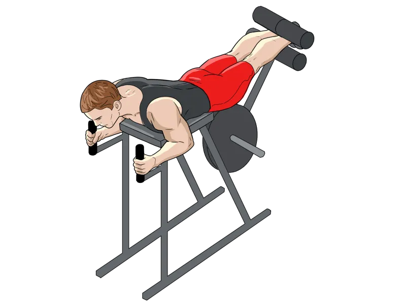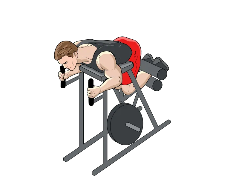 В тренажере для обратной гиперэкстензии необходимо лечь на живот, так, чтобы таз и ноги свободно свисали вниз, упереться локтями в платформу тренажера, а ладонями захватиться за рукояти.