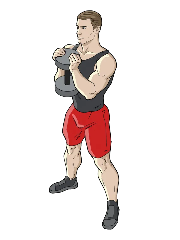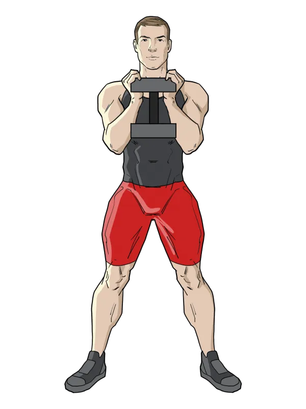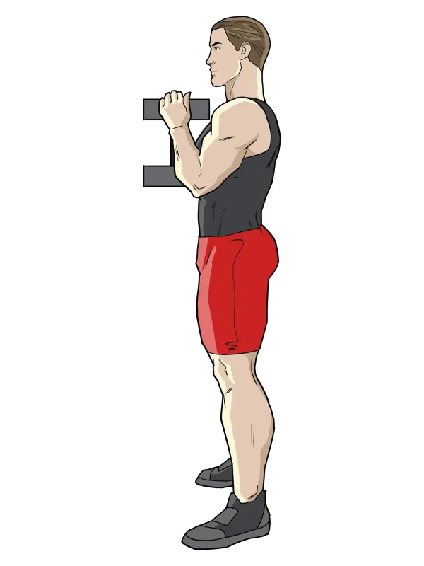 Удерживайте спину прямой, а гантель в стабильном положении перед грудью.