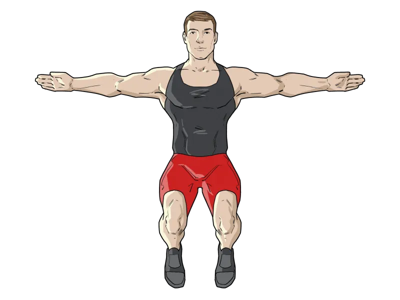 Первая фаза: сгибание грудной клетки и сведение рук вперед перед собой параллельно полу, ладони направлены внутрь друг к другу.