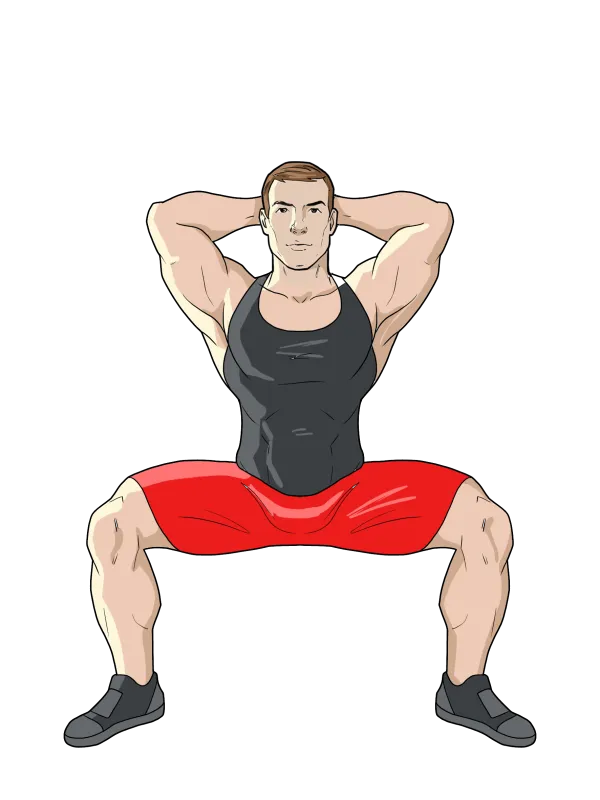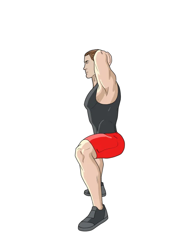 В нижней фазе мы должны наблюдать два угла 90 градусов: в коленных суставах и в тазобедренных по отношению к корпусу.