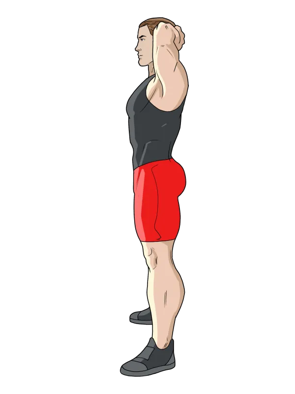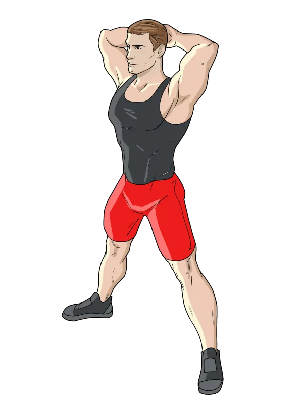 Руки расположите перед собой в молитвенном жесте на уровне груди или за головой, как это показано на изображении ниже.