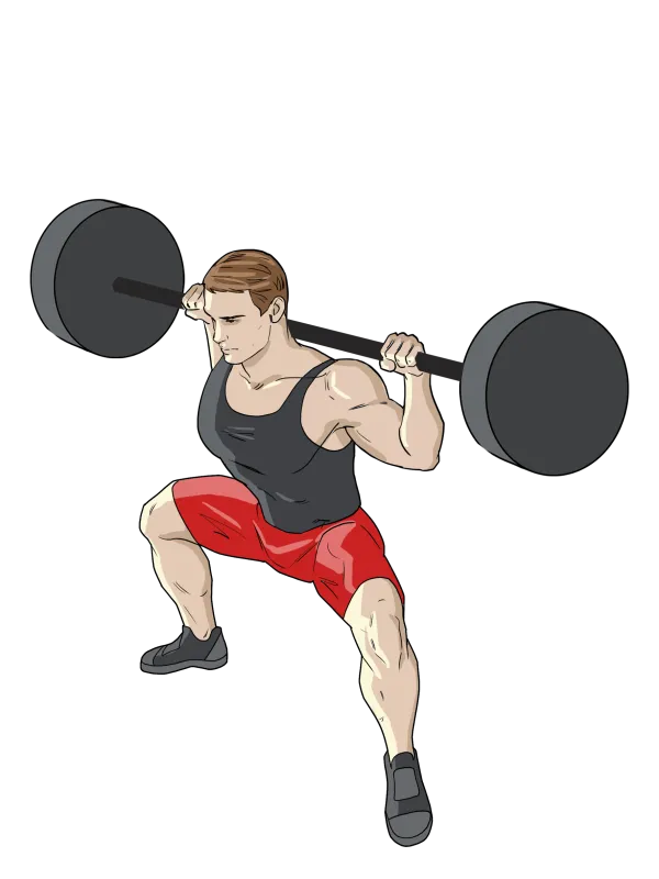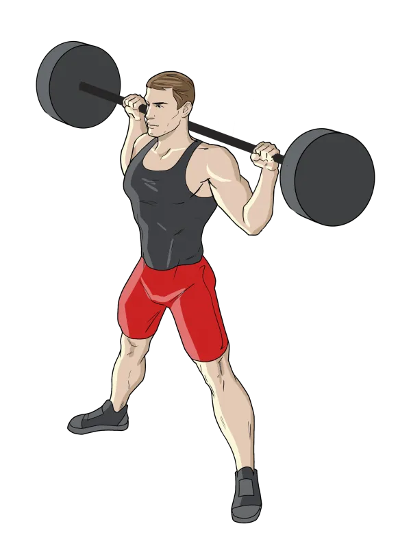 Корпус немного смещается вперёд, но удержание веса штанги строго центрировано, сильный наклон корпуса недопустим.